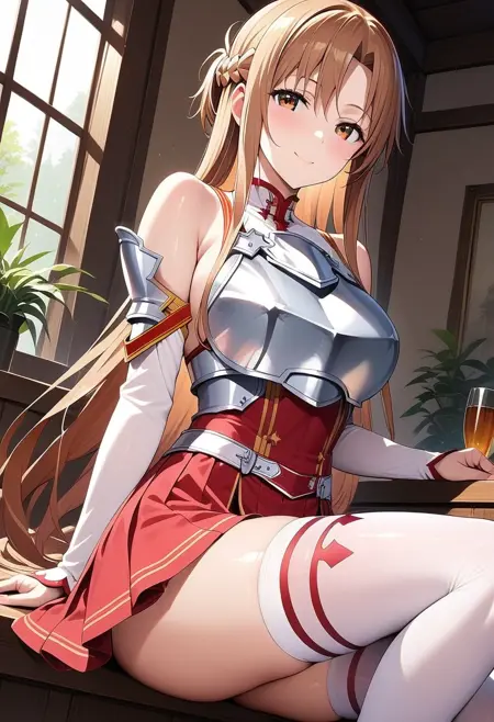 トリガーワード: asuna_a_xl, asuna (sao), 長い髪, 非常に長い髪, 茶色の髪, 编み込み, 茶色の目, アーマー, 胸甲, 肩を露出, 外れ袖, 赤いスカート, レッグハイ, 白いレッグハイ,
