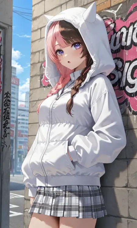 hinano vcrgta, twin braids, hooded jacket, hood up, white jacket, plaid skirt, pleated skirt- You can add