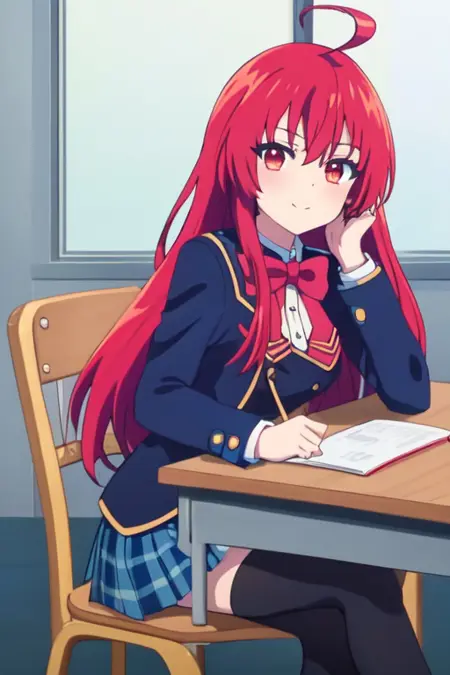 dark colors, liar liar anime lineart, 1girl, solo, saionji sarasa, red hair, long hair, ahoge, singletail on the left, crystals hair ornament, hair ornament, blue school uniform, jacket, long sleeves, red bowtie, blue with light blue plaid skirt, black thighhighs, siting on chair, inside classroom, looking at viewer
