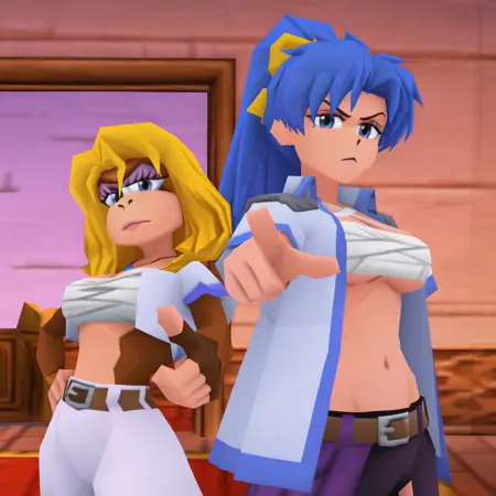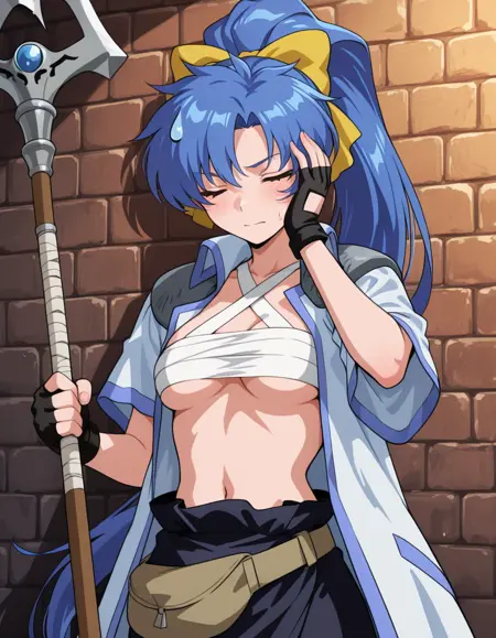 기본: 열린 로브, 가슴 수건, 긴 치마, 허리 파우치, 한 손 장갑, 무기 들고 있음, 부츠,