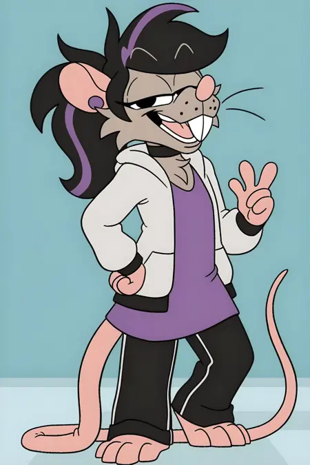 | 训练词汇 | M0lly_r4tt0, line art, flat colors, rat, solo, female, black hair, swept bangs, purple highlights, ponytail, purple ear piercing, grey fur, grey body, cheek tuft, pink nose, buckteeth, black eyes, eyelashes, choker, sweatpants, baggy topwear, grey hoodie, open clothing, purple shirt, long sleeves, rat tail, barefoot, pink feet, 已复制! |