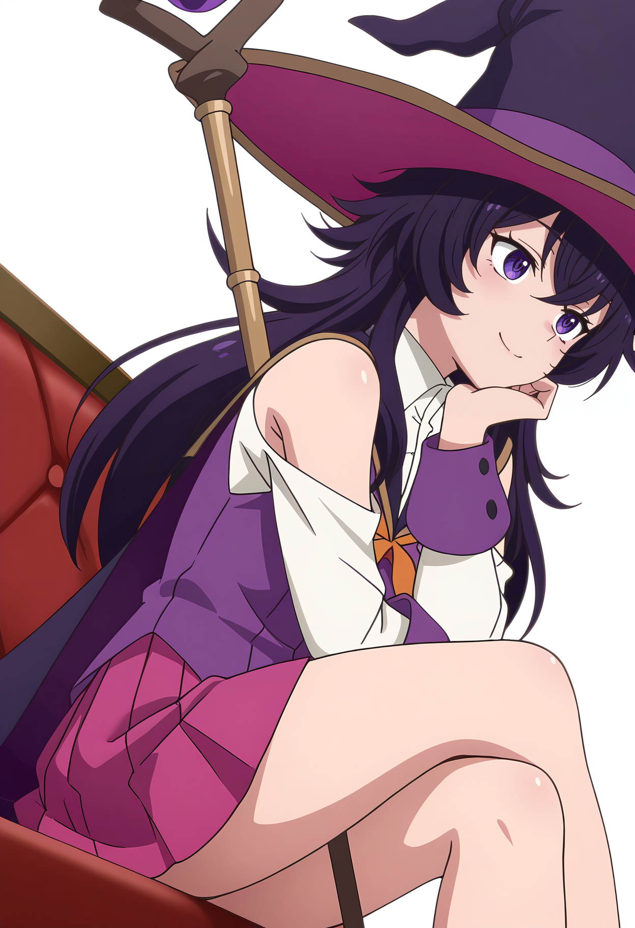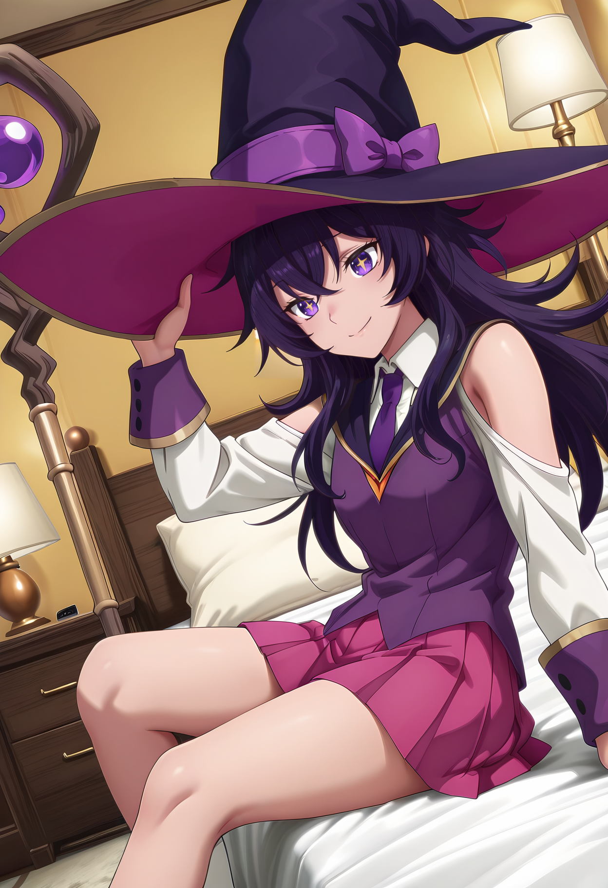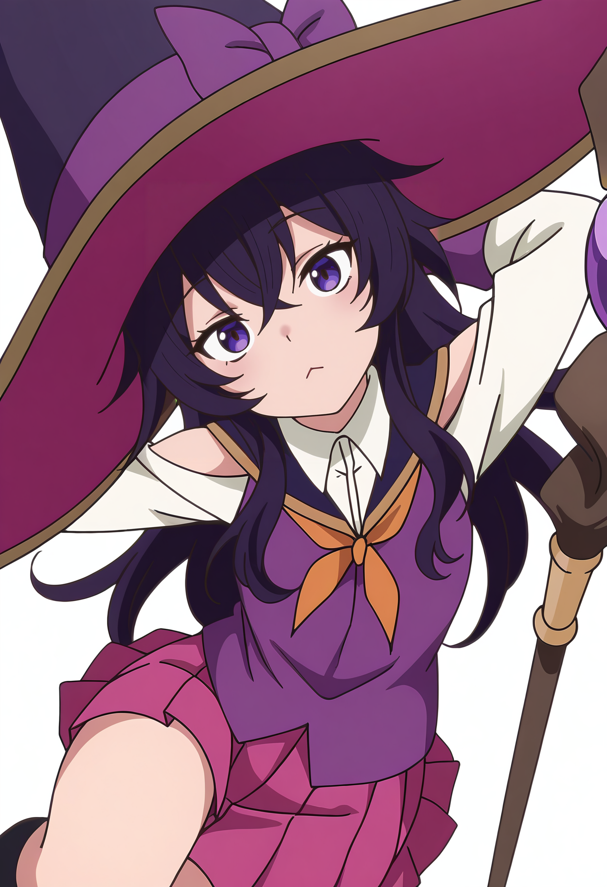 witch hat,pink pleated skirt,school uniform, shoulder cutout,