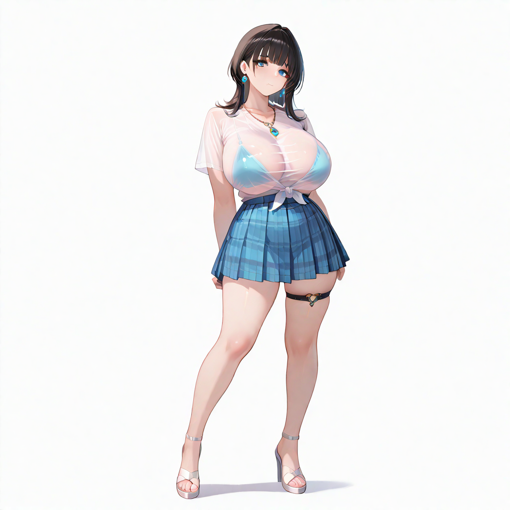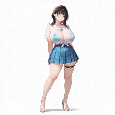 tied_shirt,see-through_shirt,blue_bikini,blue_skirt,plaid_skirt,pleated_skirt,thigh_strap,high_heel_sandals,white_footwear,
