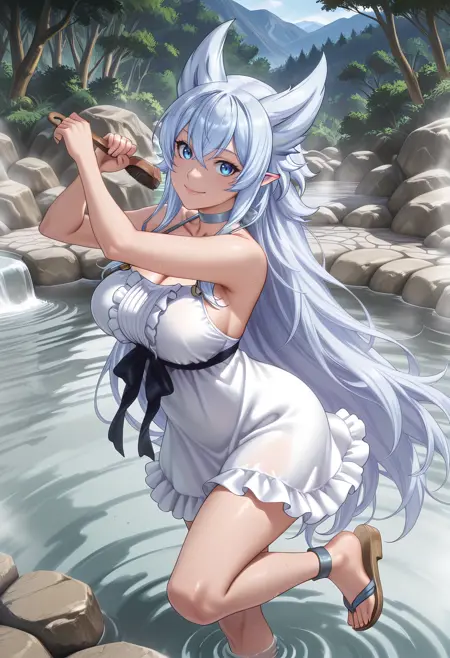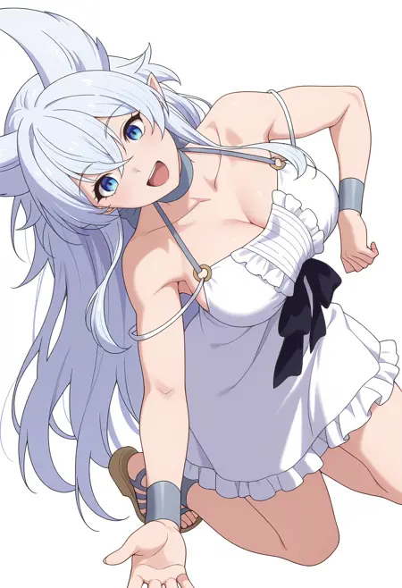 fenrys/cnn, 1girl,very long hair, blue eyes, hair between eyes, pointy ears, large breasts,collarbone,