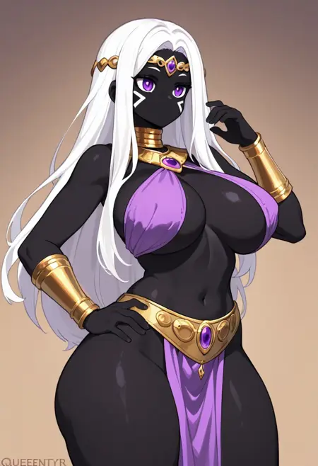 | 训练词汇 | 1girl, colored skin, black skin, circlet, facial mark, white hair, long hair, white hair, circlet, purple pelvis curtain, gold belt, neck ring, bracer, large breasts, purple eyes, no mouth, hand on hip, hand up, thick thighs, <lora:queentyranime-40:1>, queentyr, golden bra已复制! |