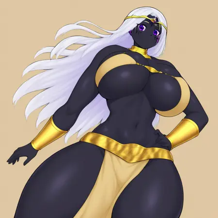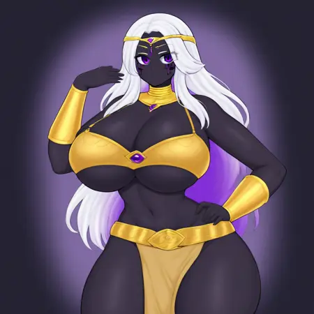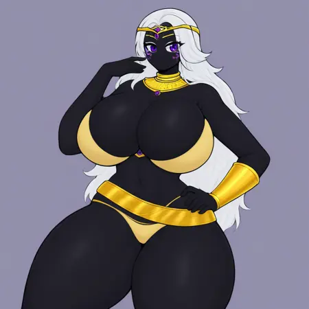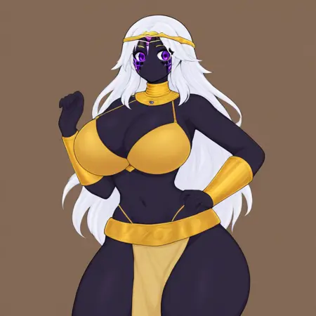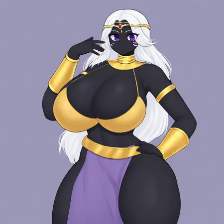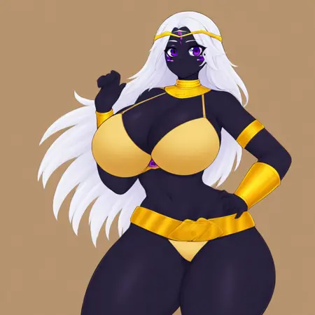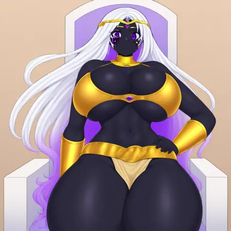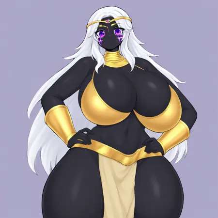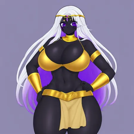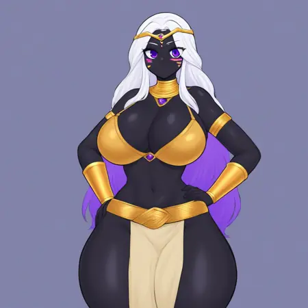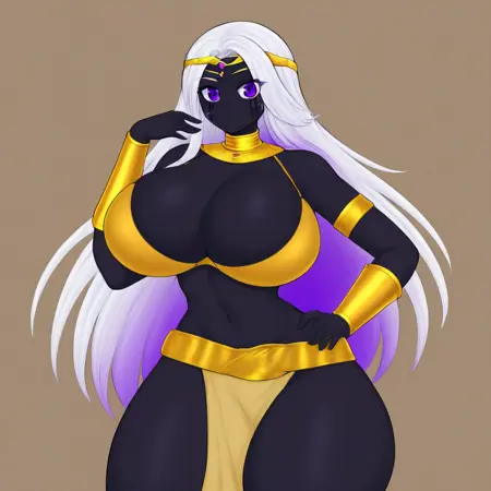 | 학습된 단어 | 1girl, colored skin, black skin, circlet, facial mark, white hair, long hair, white hair, circlet, purple pelvis curtain, gold belt, neck ring, bracer, large breasts, purple eyes, no mouth, hand on hip, hand up, thick thighs, <lora:queentyranime-40:1>, queentyr, golden bra복사됨! |