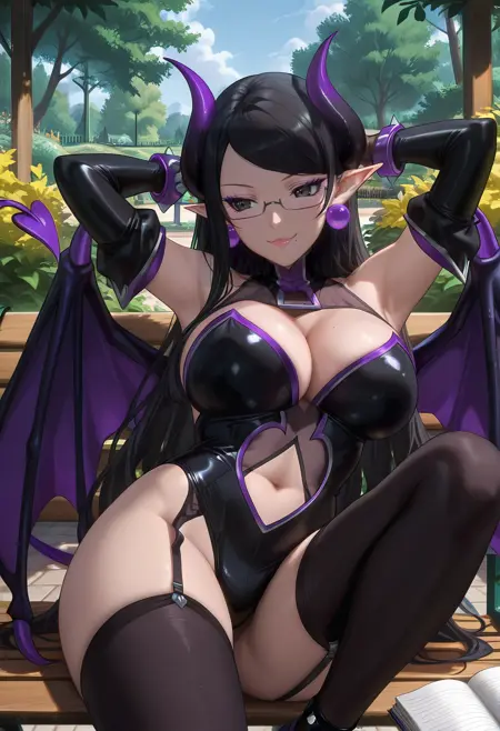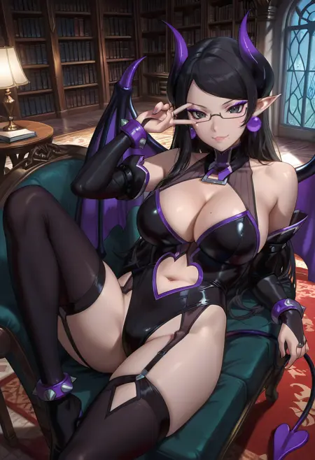 phufun/cnn, 1girl, black hair, pointy ears,bangs, mole under mouth,large breasts,cleavage,makeup, demon girl, demon wings,demon horns, demon tail, makeup,