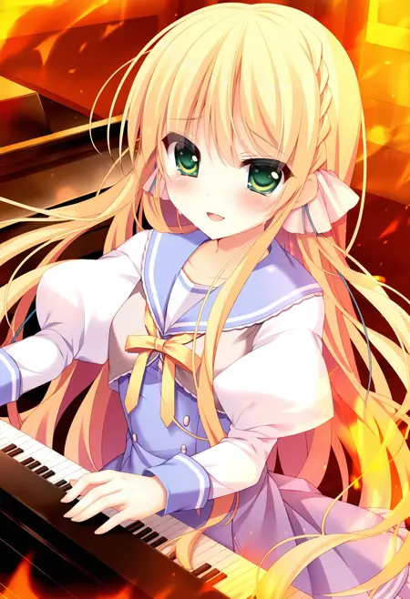 lora:Kisaki\_Illustrious+noobai:1, Kisaki, 1girl, 팬티스타킹, 학교 uniform, 검은 팬티스타킹, 치마, 땋은 머리, 리본, 헤어 리본, 신발, 해적 칼라, 노랑 리본