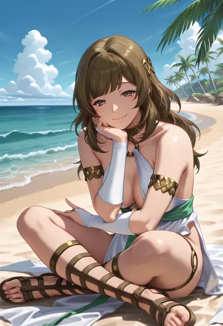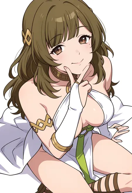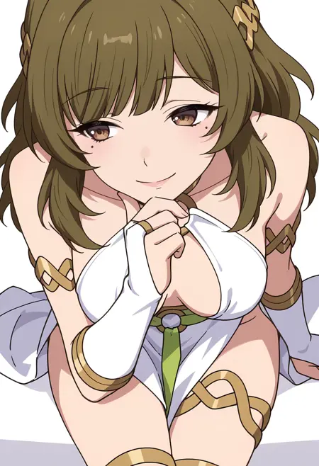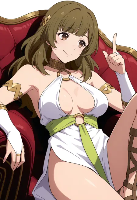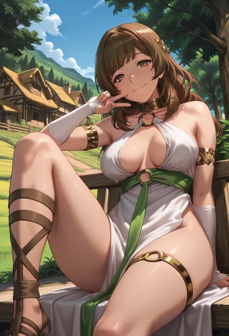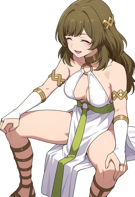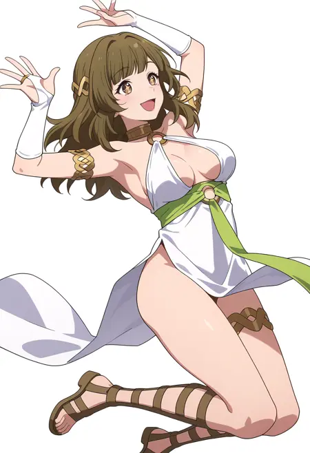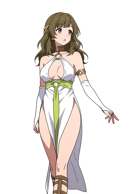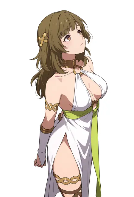 white dress, o-ring, armlet, bridal gauntlets, gladiator sandals, hair ornament, pelvic curtain, elbow gloves,