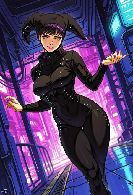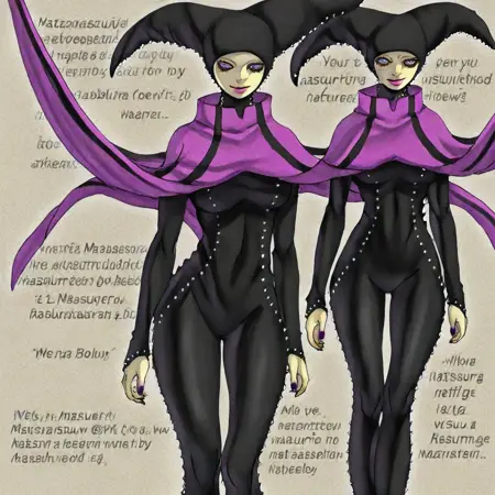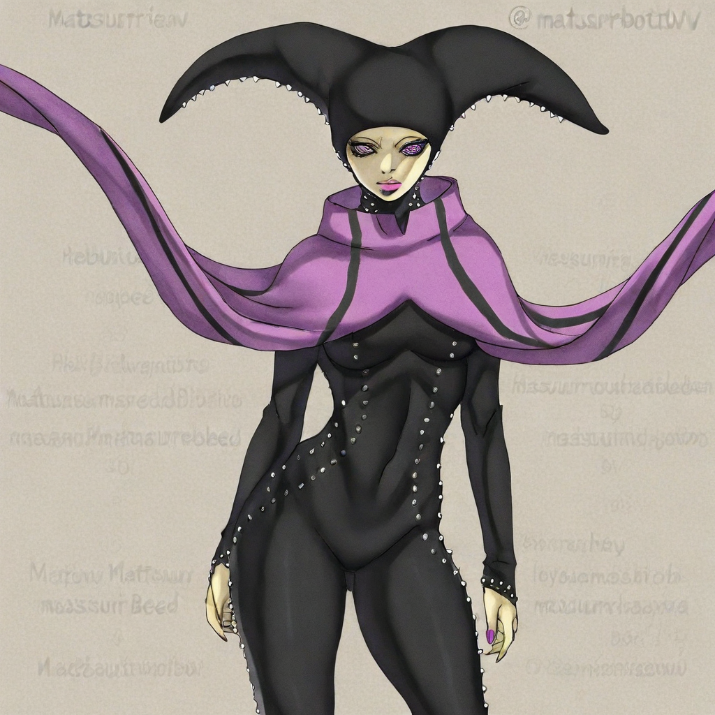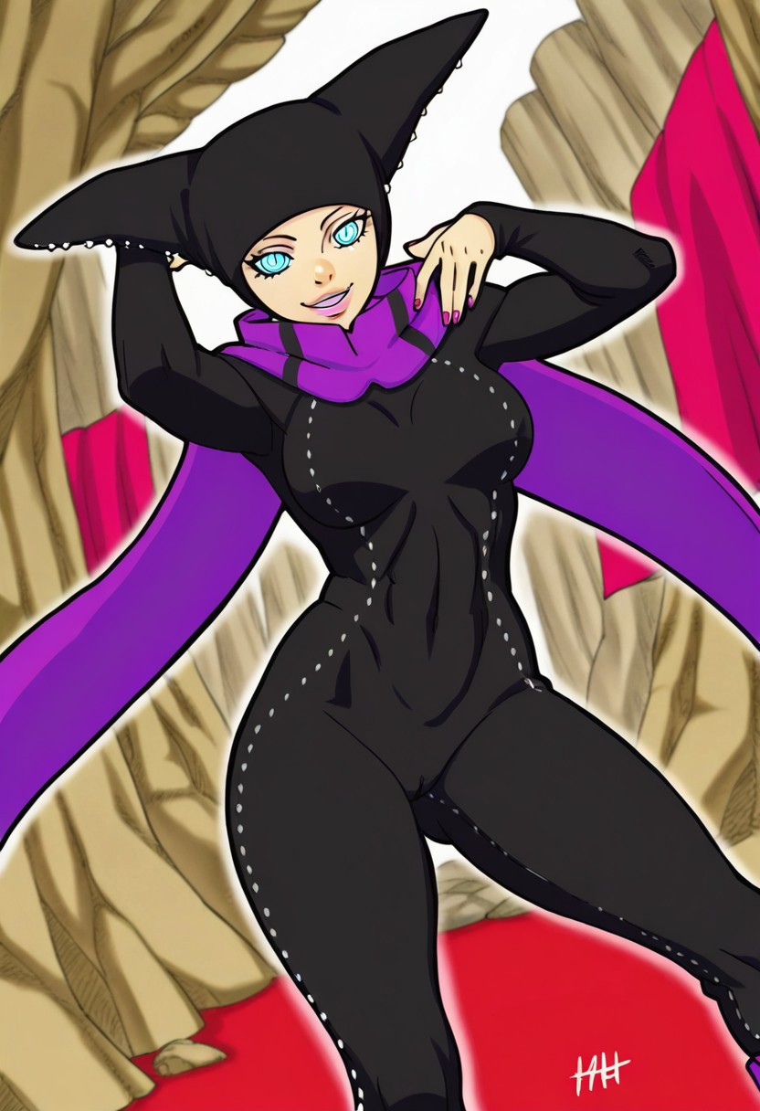 MatsuriGodTreeBTBV、1girl、solo、黒い頭部装具、縞模様の目、ピンクの唇、大きな胸、黒いスパイク付きボディスーツ、縞模様の四点状マゼンタカラー、黒いスパイク付きフード、紫の輪廻眼、太い太もも、ハイヒールの踝ブーツ、ピンクの爪、