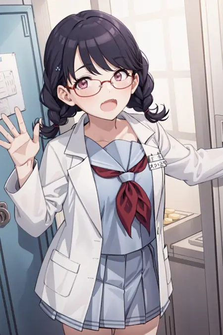 낮은 트윈 브레드, 헤어클립, 안경, 랩코트, 주름치마, 세라후쿠, 빨간 넥커치프, 이름표, 검정 양말