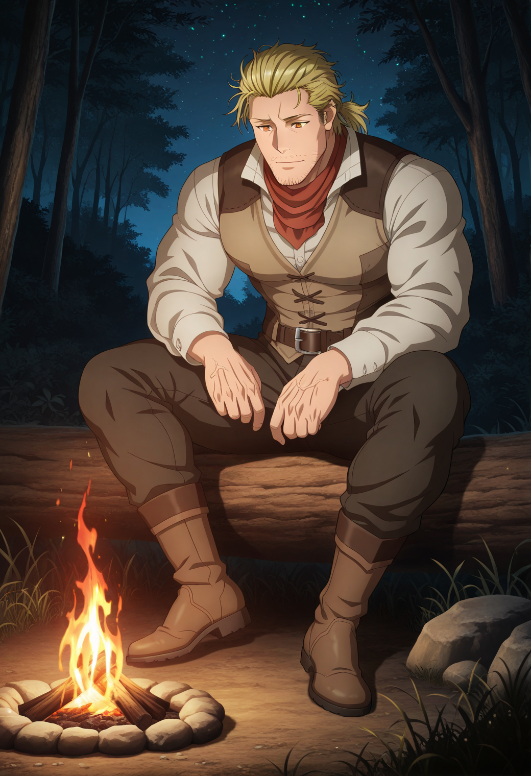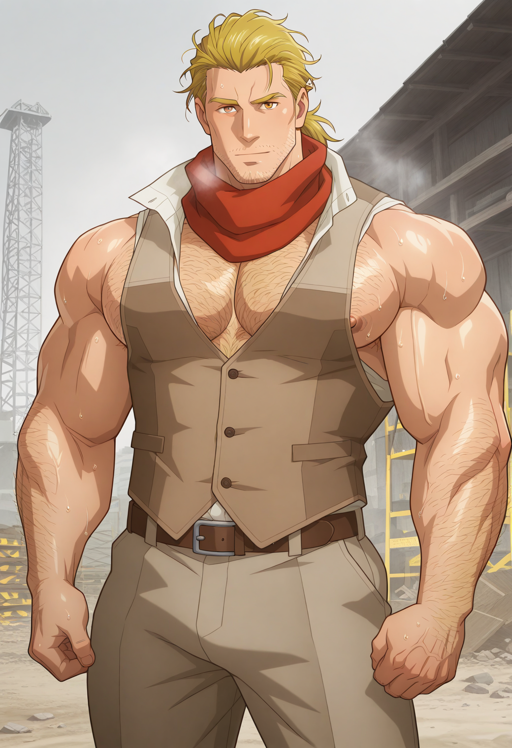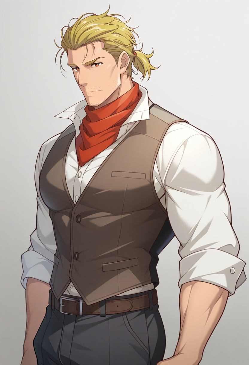 宽领衬衫,背心,腰带,裤子,红围巾,