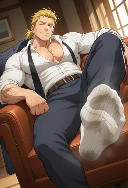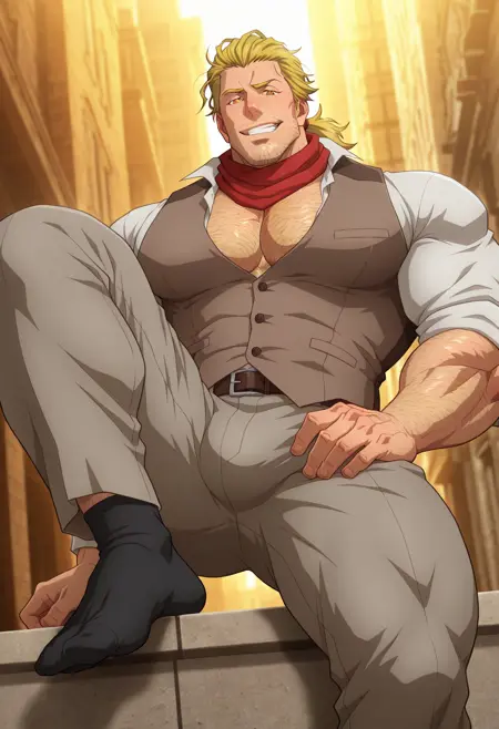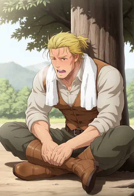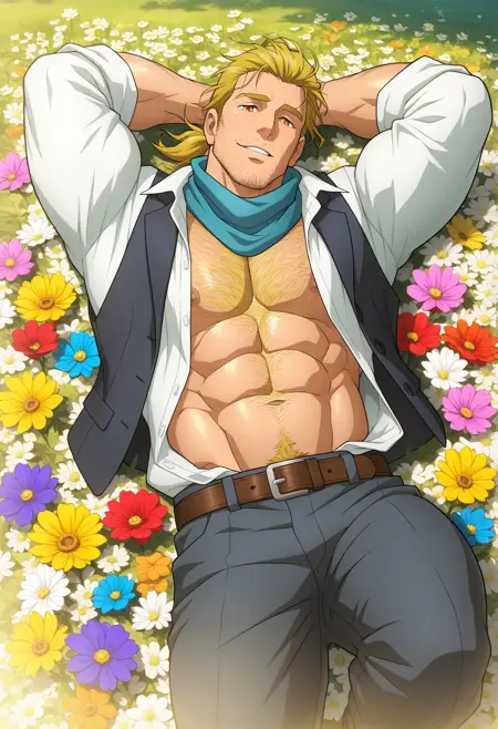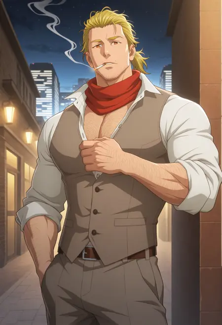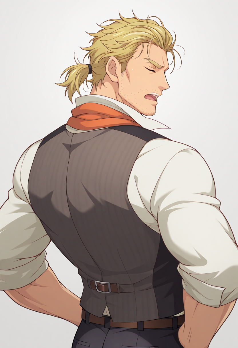 T_U_A_M,金发,胡茬,琥珀色眼睛,凌乱的头发,头发向后梳,长发,短马尾,男性,成年人,成熟,阳刚,