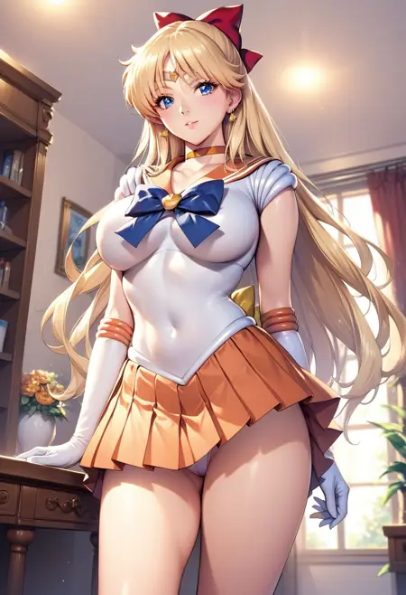 トリガー語: venus_a_pxl, 1girl, solo, セーラーヴェヌス, 長髪, 金色の髪, 赤いリボン, 髪のリボン, 青い目, 冠, ジュエリー, ピアス, チョーカー, オレンジのチョーカー, セーラーカラー, オレンジのセーラーカラー, リボン, セーラー戦士ユニフォーム, オレンジのスカート, プリーツスカート, 白い手袋, 肘まで手袋, 膝上のブーツ,