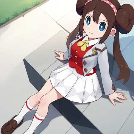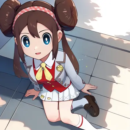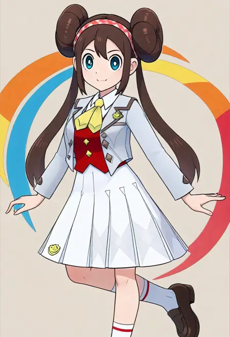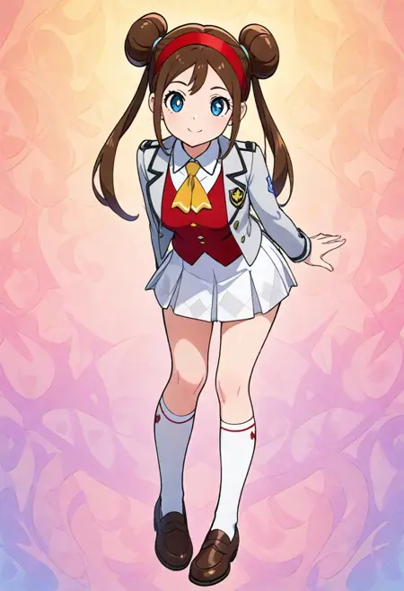acrosa, def colors, blue eyes, white pupils, brown hair, double bun, twintails, red hairband, light grey jacket, open jacket, white shirt, collared shirt, long sleeves, red vest, buttons, yellow ascot, white skirt, white socks, kneehighs, loafers, brown footwear