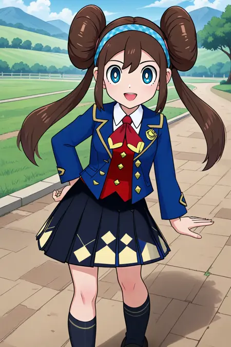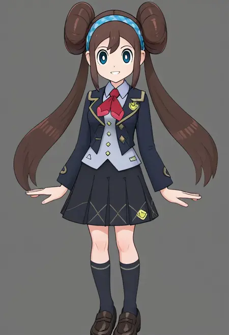 acrosa, ex colors, blue eyes, white pupils, brown hair, double bun, twintails, blue hairband, black jacket, open jacket, black shirt, collared shirt, long sleeves, light grey vest, buttons, red ascot, black skirt, black socks, kneehighs, loafers, black footwear