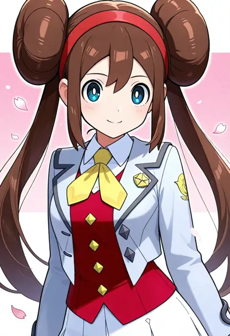acrosa, 기본 색상, 파란 눈, 흰 동공, 갈색 머리카락, 더블 둥, 트윈테일, 빨간 머리띠, 연회색 재킷, 열린 재킷, 흰 셔츠, 칼라 셔츠, 긴 소매, 빨간 조끼, 단추, 노란 애크셋, 흰 치마, 흰 양말, 무릎높이 양말, 로퍼, 갈색 신발