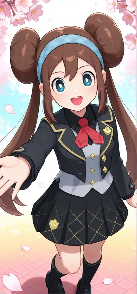 acrosa, EX 색상, 파란 눈, 흰 동공, 갈색 머리카락, 더블 둥, 트윈테일, 파란 머리띠, 검정 재킷, 열린 재킷, 검정 셔츠, 칼라 셔츠, 긴 소매, 연회색 조끼, 단추, 빨간 애크셋, 검정 치마, 검정 양말, 무릎높이 양말, 로퍼, 검정 신발
