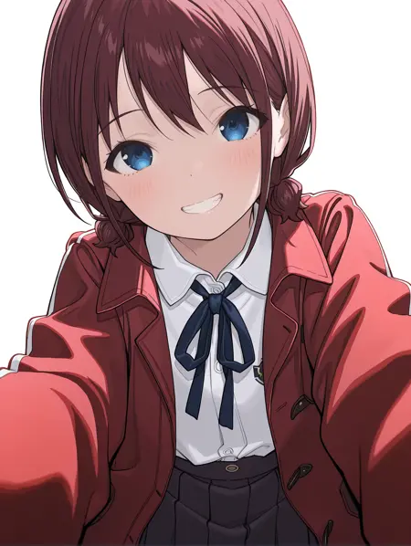 의상(임시) ・ 빨간 코트, 긴 소매, 목 립본, 흰색 칼라 셔츠, 검은 접힌 스커트, 흑색 허벅지 양말, 끈 신발,
