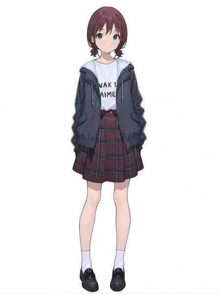 의상(임시) ・ 재킷, 체크무늬, 셔츠, 의상에 글자, 스커트, 체크 스커트, 흰 양말, 검은 신발, 흰 배경, 단순한 배경,