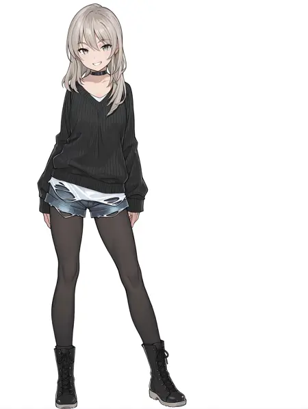 의상(임시) ・open clothes, black sweater, denim shorts, black pantyhose, long sleeves, legwear under shorts, cross-laced footwear,