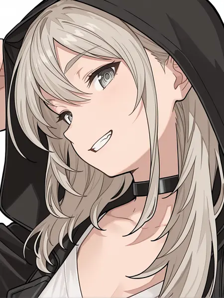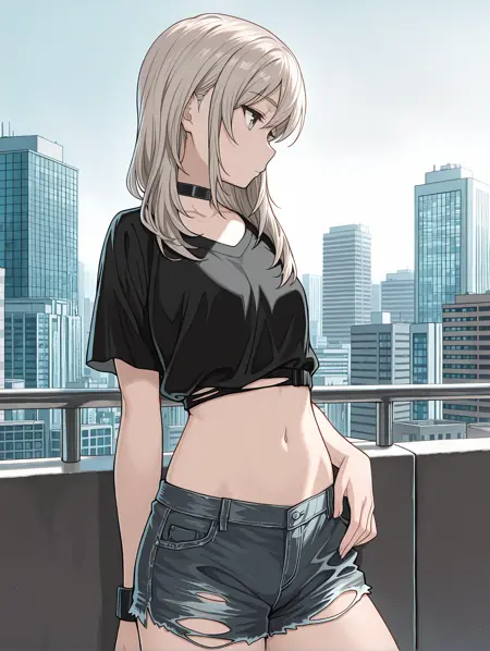 의상(임시) ・choker, jacket, open clothes, black shirt, belt, shorts, asymmetrical legwear, black thighhighs, fishnets, lace-up_boots,
