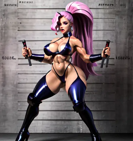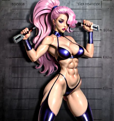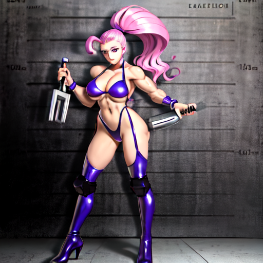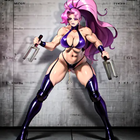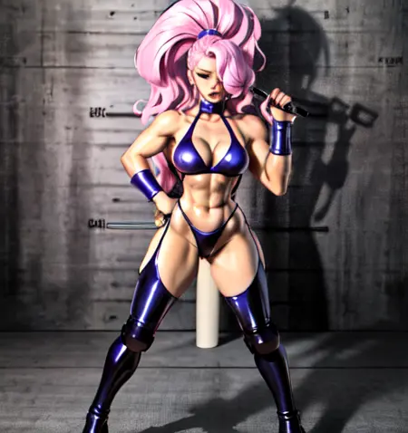 Carol_Basia、単体、1girl、紫色の目、長い髪、ポニーテール、ハイポニーテール、片目に髪がかかる、ピンクの髪、胸、大きな胸、胸元の開き、へそ、大きなヒップ、太ももまでの靴下、太い太もも、筋肉質な女性、腹筋、ビキニトップのみ、トランクス型ビキニ、ラテックスビキニ、紫のビキニ、ブレスレット、太ももブーツ、ラテックス、膝パッド、ハイヒール、手持ち、武器を保持、真剣、怒り、立ち姿、