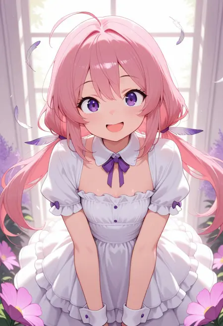 : civchan、ピンクの髪、紫の目、メイド、メイド頭飾り