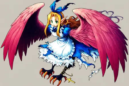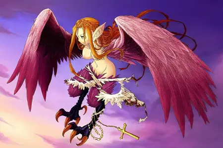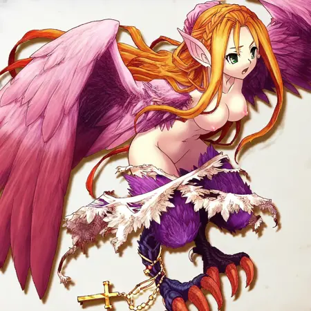 ハーピー形態:KITN_CPiche、ハーピー、緑の目、尖った耳、金髪、長い髪、裸、羽ばたく翼、翼のある腕、鳥の脚、鋭い爪、鳥の脚、左の爪にロザリオ、裂けたスカート、白いスカート、横髪。また、白目なしの黒目でCGの精度を高めるために訓練しましたが、結果はあまり良くありませんでした。