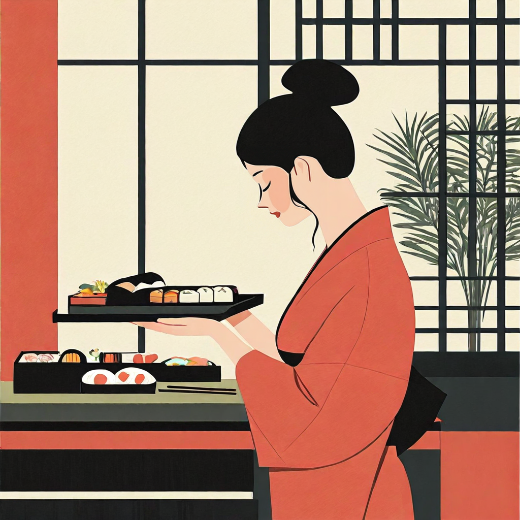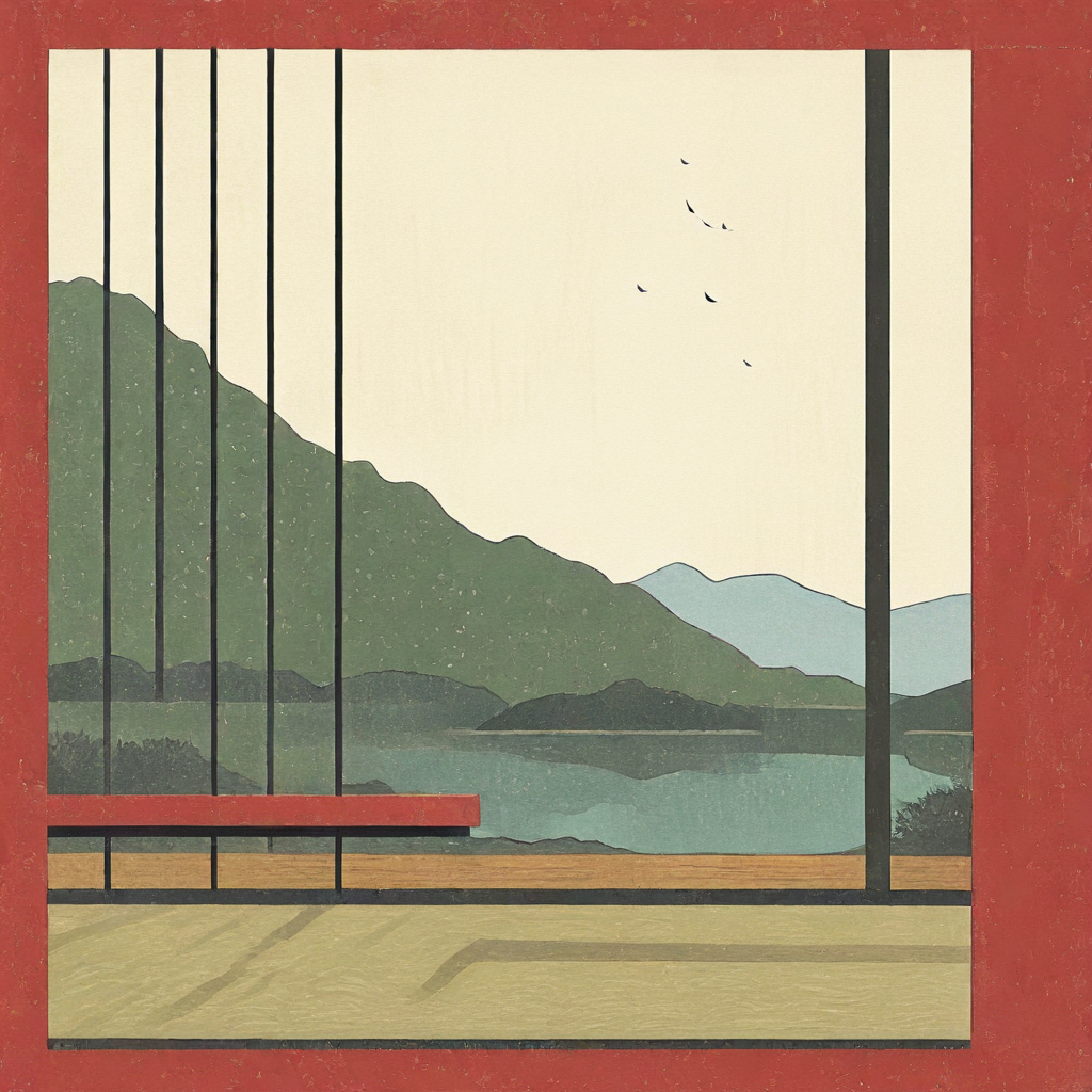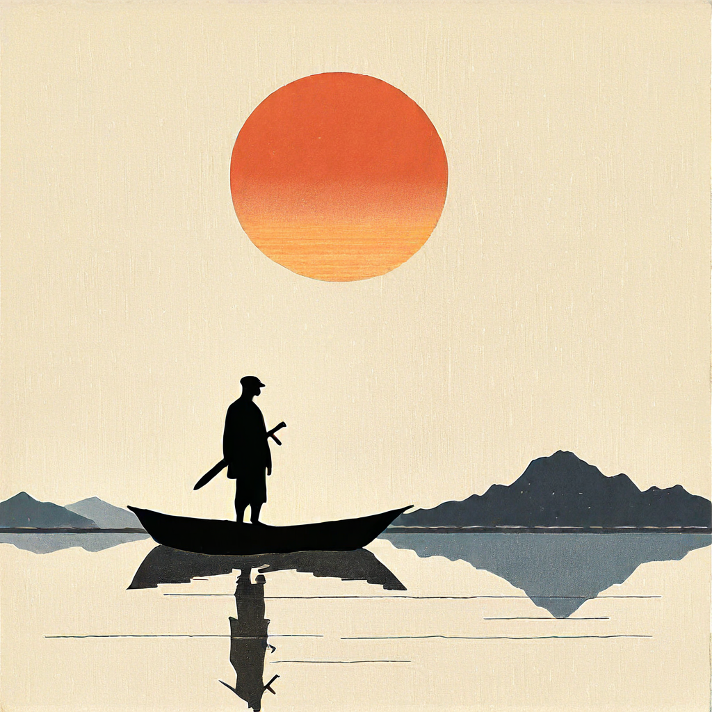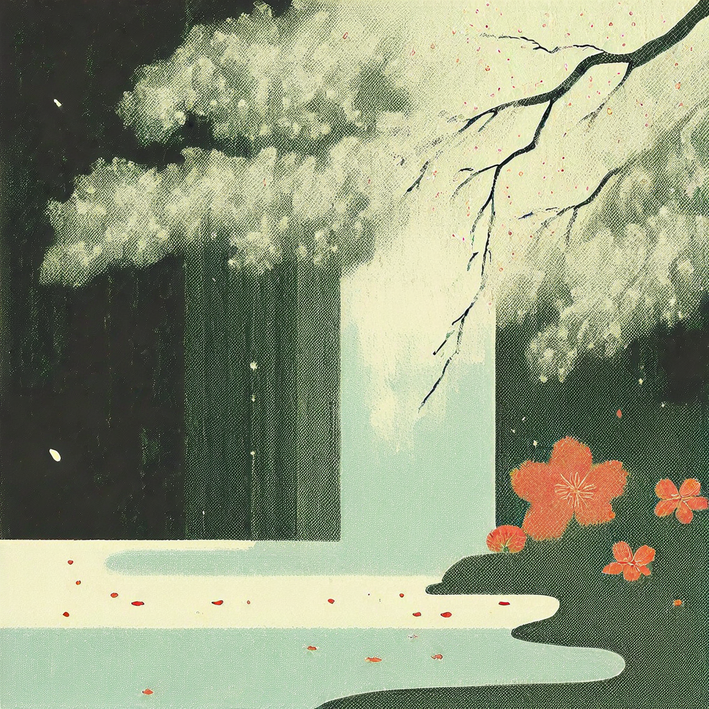 Mid-century modern illustration meets Japanese ukiyo-e, geometric simplified forms with traditional woodblock textures. It is minimalist yet narrative-rich.