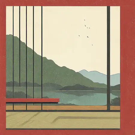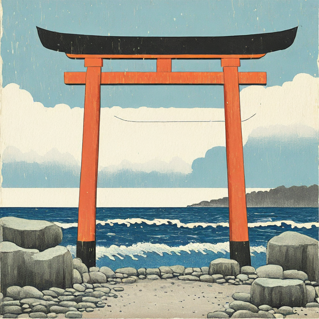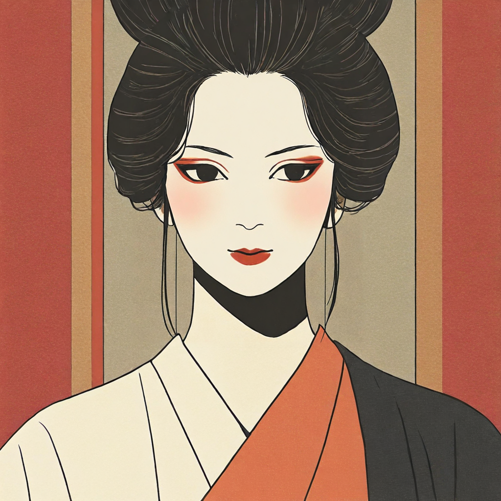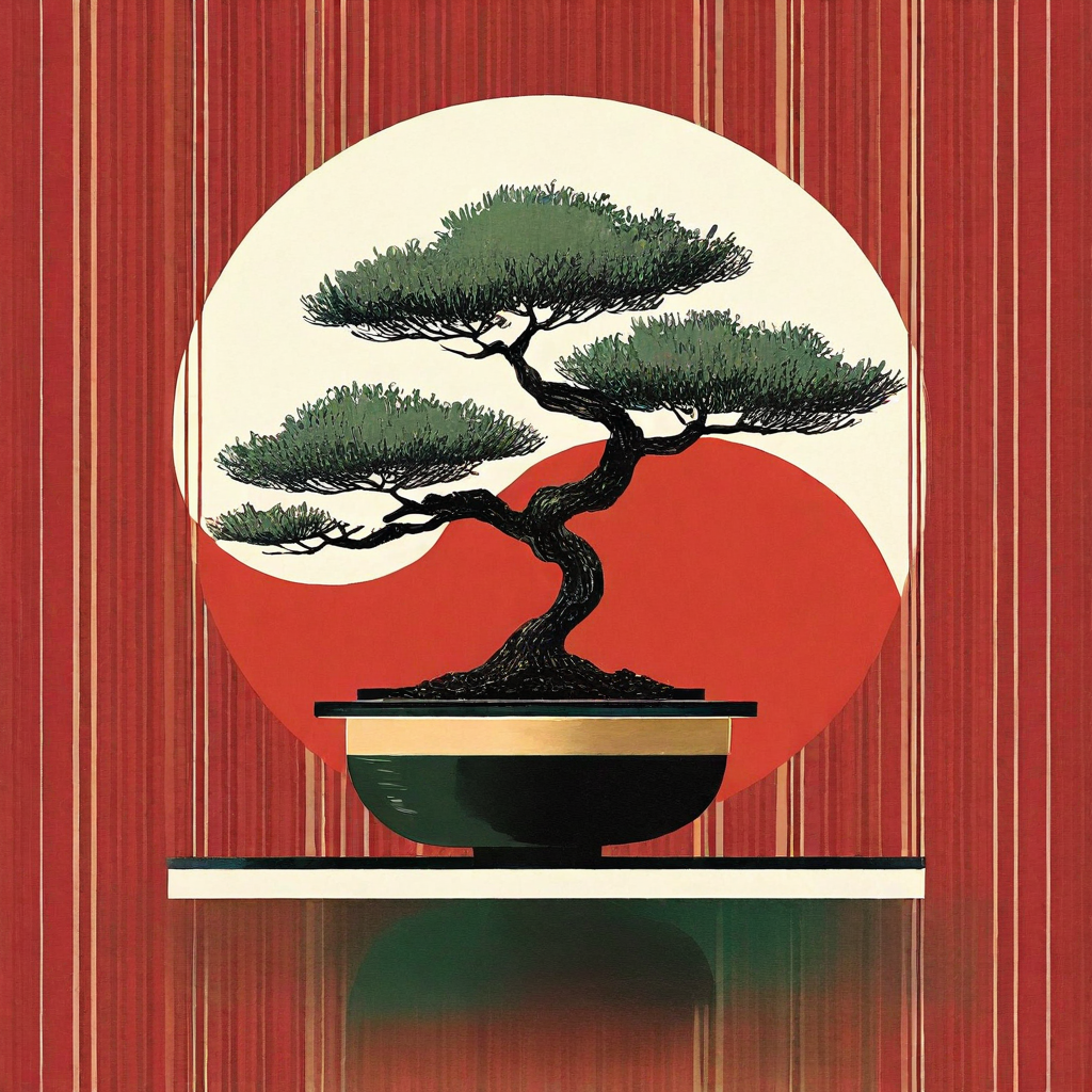 Mid-century modern illustration meets Japanese ukiyo-e, geometric simplified forms with traditional woodblock textures. It is minimalist yet narrative-rich.
