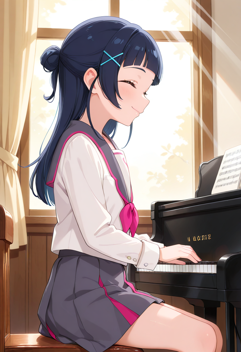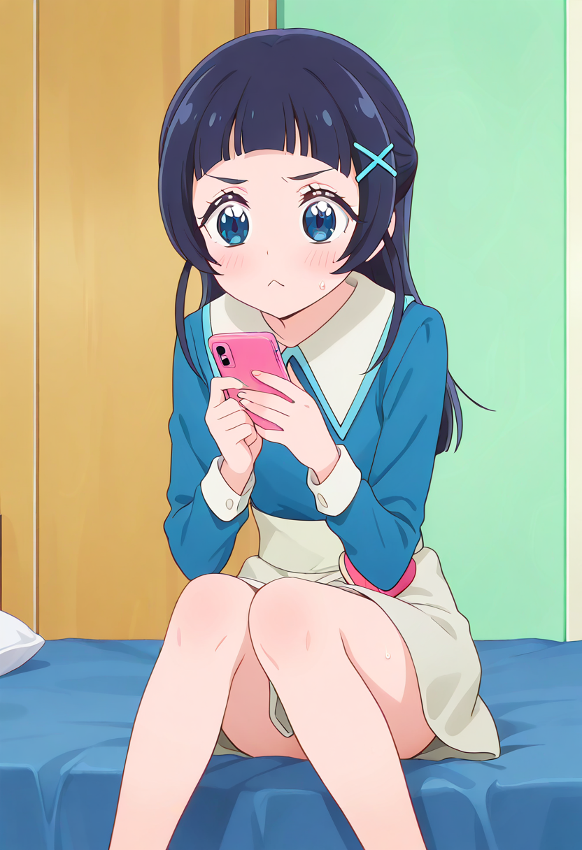 aokaze nana, long hair, dark blue hair, blunt bangs, shiny hair, sidelocks, half updo, straight hair, hairclip, x hair ornament, blue eyes, eyelashes일상복