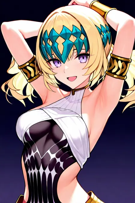 중간 크기 가슴, polluxdef, 어깨 노출, 헬터넥, 검은 셔츠, 팔찌, 팔보호대, 사타구니, 검은 팬티, 허리 갑옷, 금색 갑옷, 골반 장식, 흰 로브, 하이힐 샌들, 금색 신발