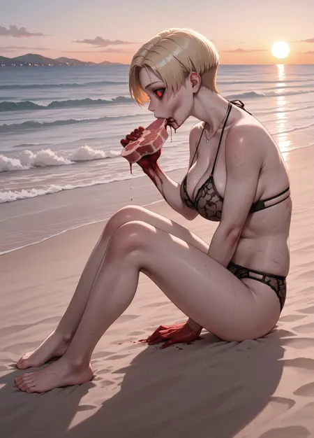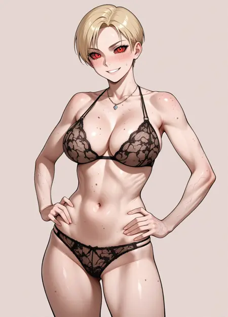 Appearance: 1girl, solo,blonde hair, short haircut, red eyes, red sclera, large breasts, tanned skin, , visible veins, skin rash,