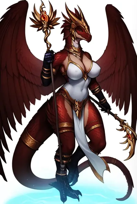 1girl, Fe'ra, furry female, large breasts, wide hips, talons, claws, yellow sclera, feathered wings, red wings, feathers
