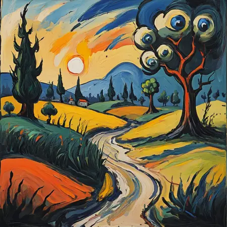 A fusion of cartooning and Expressionism—simplified, exaggerated characters with distorted forms and raw emotional intensity. Both satirical and heartfelt, yet slightly unsettling, this style channels the whimsy of Dr. Seuss with the eerie urgency of Edvard Munch.