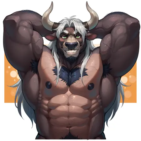score_9, score_8_up, score_7_up, by nightterror, furry, furry male, anthro, bull, bovid, 1boy, bara, male focus, solo, veins, veiny, muscular male, chest hair, pectorals, horns, animal sout, green eyes, long hair, grey fur, grey hair, large pectorals, stomach, abs, nipples, navel hair, animal ears, navel, nude, smile, facial hair, hairy, upper body, mature male, cropped torso, grin, completely nude, looking at viewer, arm hair, body hair, armpit hair, male pubic hair, thick eyebrows, geometric background