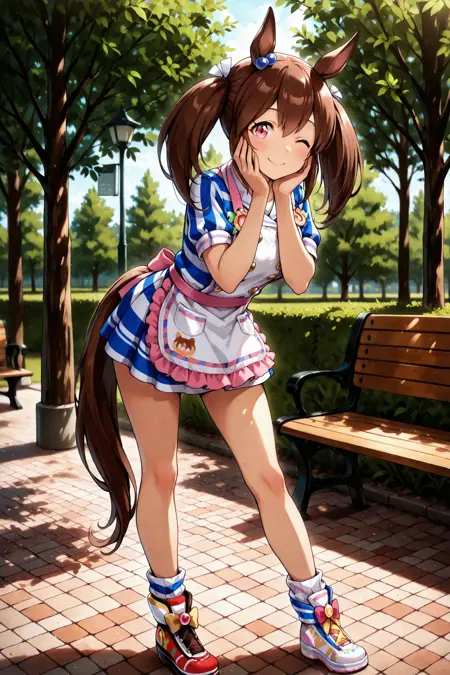 hishi akebono \(umamusume\), horse tail, horse girl, apron, striped clothes, mismatched footwear,