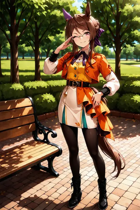 royce and royce \(umamusume\), horse tail, horse girl, glasses, long sleeves, white sleeves, orange jacket, cropped jacket, belt, white skirt, pencil skirt, orange skirt, half-skirt, pantyhose, lace-up boots,