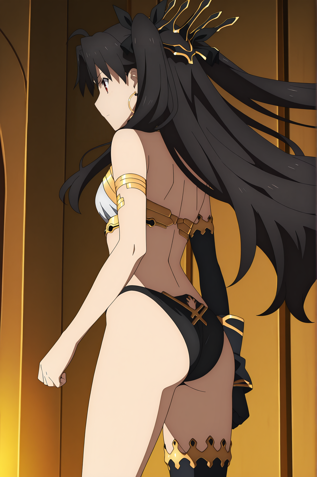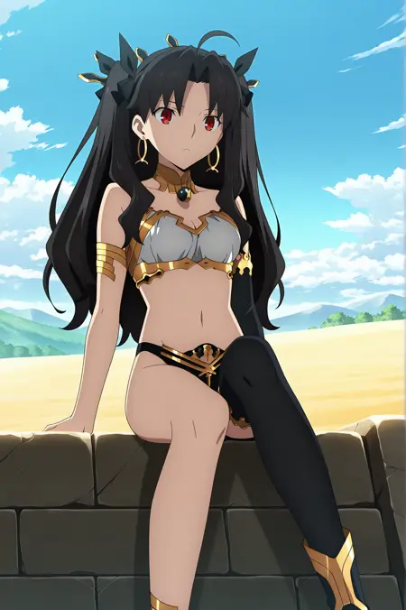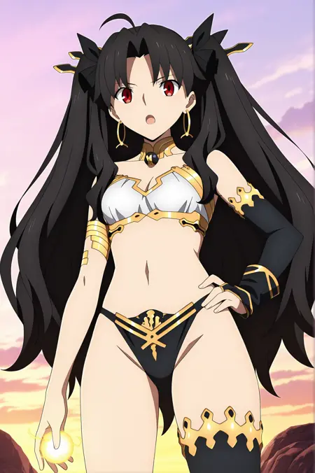 Ishtar, long hair, red eyes, black hair, two side up, bangs, ahoge, parted bangs, very long hair,