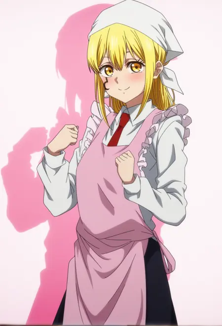 <lora:Lemon IrvineV1-IL:1>,Lemon Irvine,yellow eyes,blonde hair,long hair,hair between eyes,bangs,facial mark,ch2,ch2 head scarf,ch2 white head scarf,ch2 bandana,ch2 necktie,ch2 red necktie,ch2 shirt,ch2 white shirt,ch2 long sleeves,ch2 apron,ch2 pink apron,ch2 kappougi,ch2 skirt,ch2 long skirt,ch2 black skirt,ch2 pantyhose,ch2 black pantyhose,ch2 shoes,ch2 brown footwear,ch2 loafers,