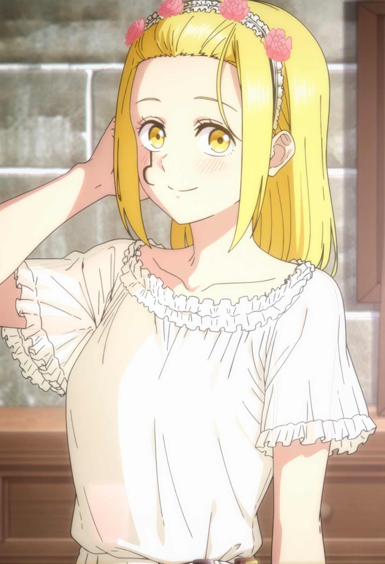 <lora:Lemon IrvineV1-IL:1>,Lemon Irvine,yellow eyes,blonde hair,long hair,hair between eyes,bangs,facial mark,ch5,ch5 flower,ch5 pink flower,ch5 hair flower,ch5 hair ornament,ch5 hairband,ch5 forehead,ch5 collarbone,ch5 sleepwear,ch5 shirt,ch5 white shirt,ch5 short sleeves,ch5 frilled seelves,ch5 frills,ch5 pants,ch5 white pants,
