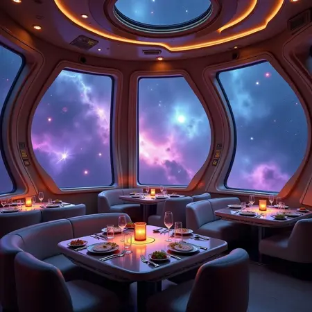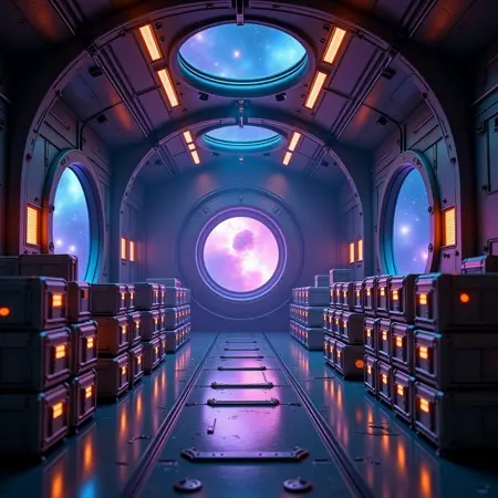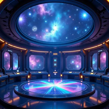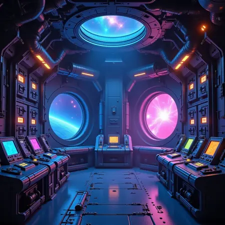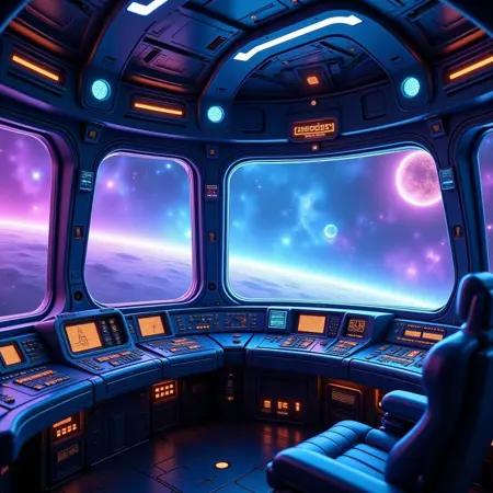 通用正面标签:captpollspaceship, captpollstarship, futuristic interior, photorealistic, sci-fi architecture, glowing lights, ambient lighting, high-tech design, smooth metallic surfaces, panoramic space windows, colorful outer space, nebula view, vibrant lighting, detailed environment, cinematic, polished floors, advanced technology, clean interior, deep space view, curved structures, neon accents, control panels, no characters