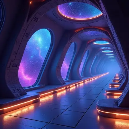 General positive tags:captpollspaceship, captpollstarship, futuristic interior, photorealistic, sci-fi architecture, glowing lights, ambient lighting, high-tech design, smooth metallic surfaces, panoramic space windows, colorful outer space, nebula view, vibrant lighting, detailed environment, cinematic, polished floors, advanced technology, clean interior, deep space view, curved structures, neon accents, control panels, no characters