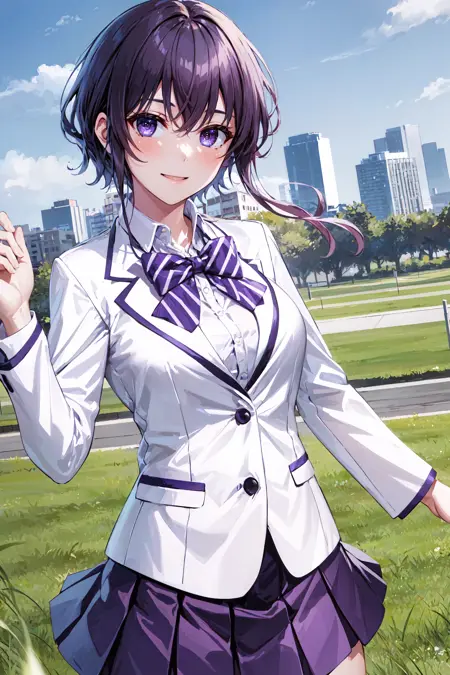 Character trigger : michiru hyodo, purple hair, short hair with long locks, purple eyes
