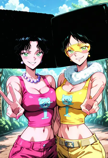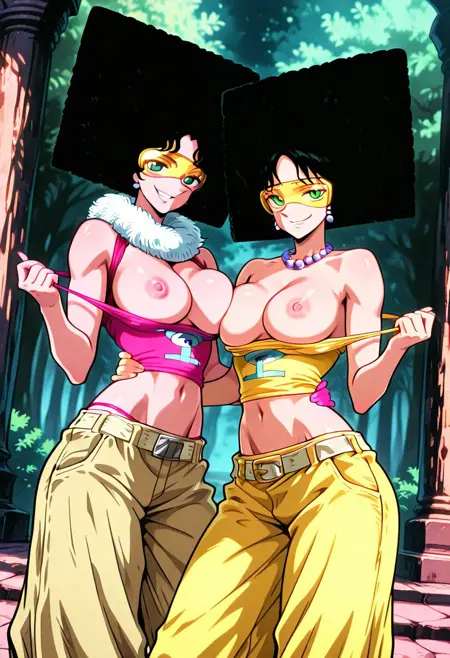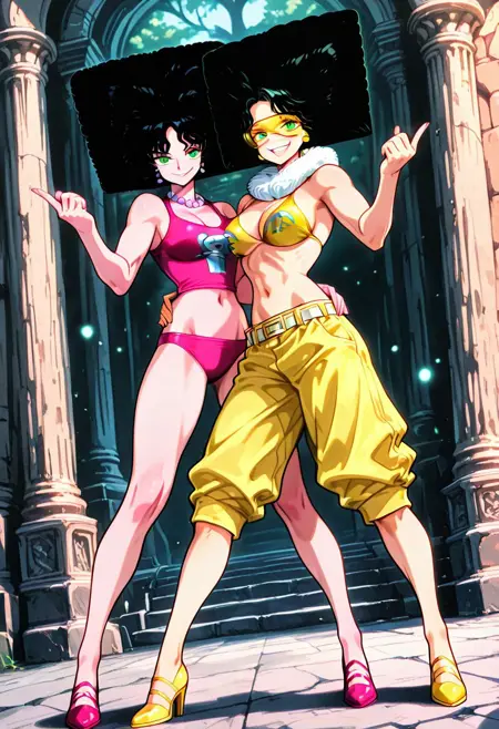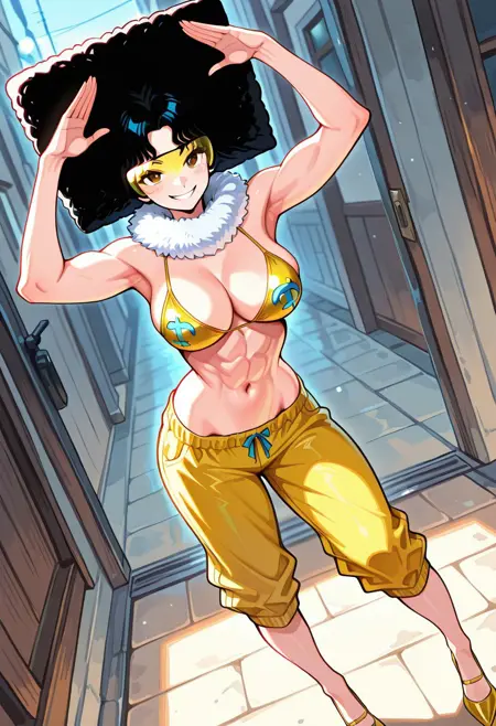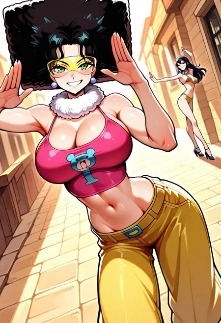 MozuOP, 1girl, large square hair, afro, black hair, curly hair, brown eyes, straight-edged hair, white fur collar, yellow goggles, yellow bikini-top, large breast, navel, midriff, groin, thick thighs, yellow slacks, high-heels,