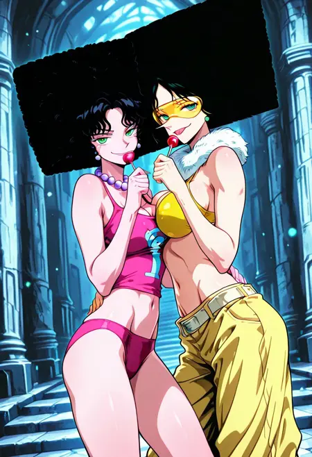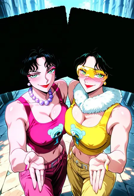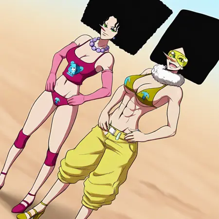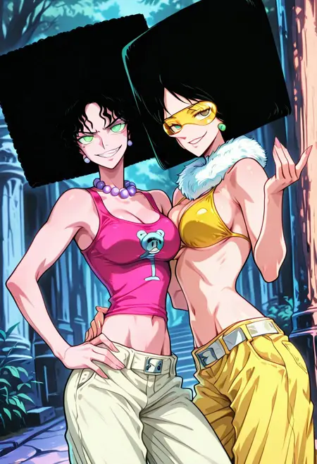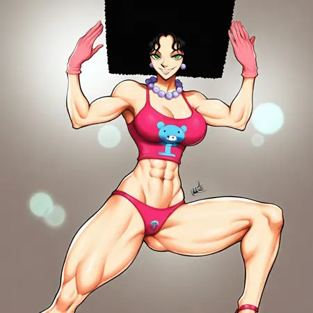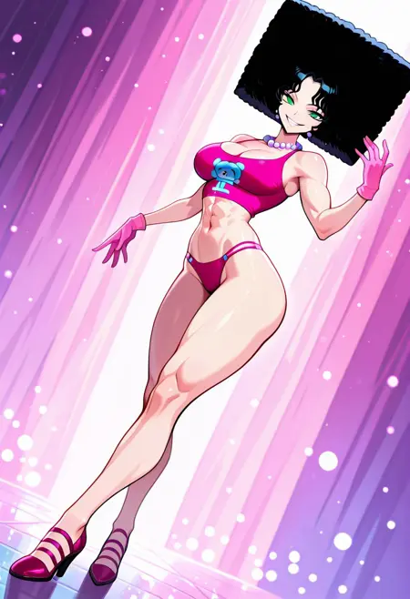 KiwiOP, 1girl, large square hair, afro, black hair, green eyes, curly-edged hair, lilac pearl necklace, large breast, pink cropped top, navel, midriff, groin, pink bikini-bottom, gloves, thick thighs, high heels,