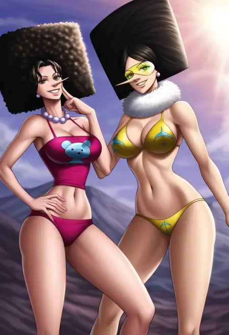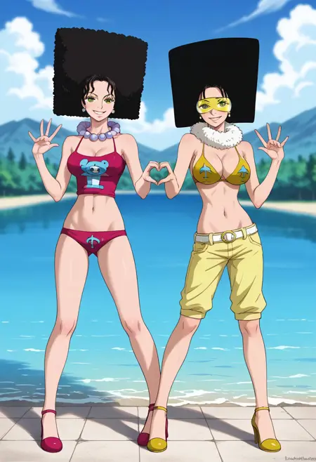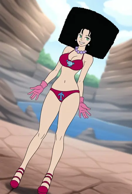 KiwiOP, 1소녀, 큰 사각 헤어, 아프로, 검은 머리, 녹색 눈, 곱슬끝 모양 헤어, 라일락 진주 목걸이, 큰 가슴, 분홍색 커트탑, 배꼽, 복부, 골반, 분홍색 비키니 하의, 장갑, 두꺼운 허벅지, 하이힐,