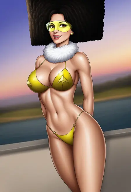 MozuOP, 1소녀, 큰 사각 헤어, 아프로, 검은 머리, 곱슬머리, 갈색 눈, 곧은 끝 모양 헤어, 흰색 털 컬라, 노란색 안경, 노란색 비키니 탑, 큰 가슴, 배꼽, 복부, 골반, 두꺼운 허벅지, 노란색 바지, 하이힐,