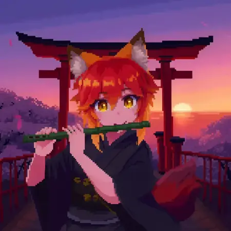 pixel art, 일몰 시각의 토리이 문 위에 앉아 바람에 떠다니는 벚꽃 사이로 대나무 피리를 연주하는, 붉은 머리와 황금색 눈을 가진 여우 귀 애니메이션 소년의 픽셀화된 풍경.